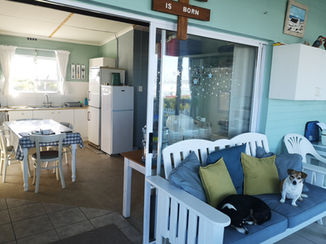 The living room is located in the front section of the bungalow, with large glass stacking doors, dining table and TV. The kitchen also has a dining table and indoor braai.