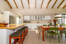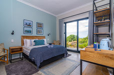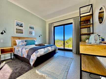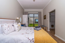 Two detached bedrooms, each with private entrances from outside and the courtyard, ensure privacy within your group. Both have their own bathrooms, coffee stations, and even a connecting door that can be locked or left open. From these rooms, enjoy distant sea views and a glimpse of the iconic Danger Point Lighthouse.