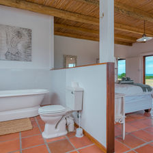 This is a very spacious house, with large open plan living room, kitchen and indoor braai. On each side of the house is a main bedroom, both with sliding doors opening to the outside, with stunning sea views. Each of these two bedrooms has an en-suite open plan bathroom as well as fire place inside the bedroom.